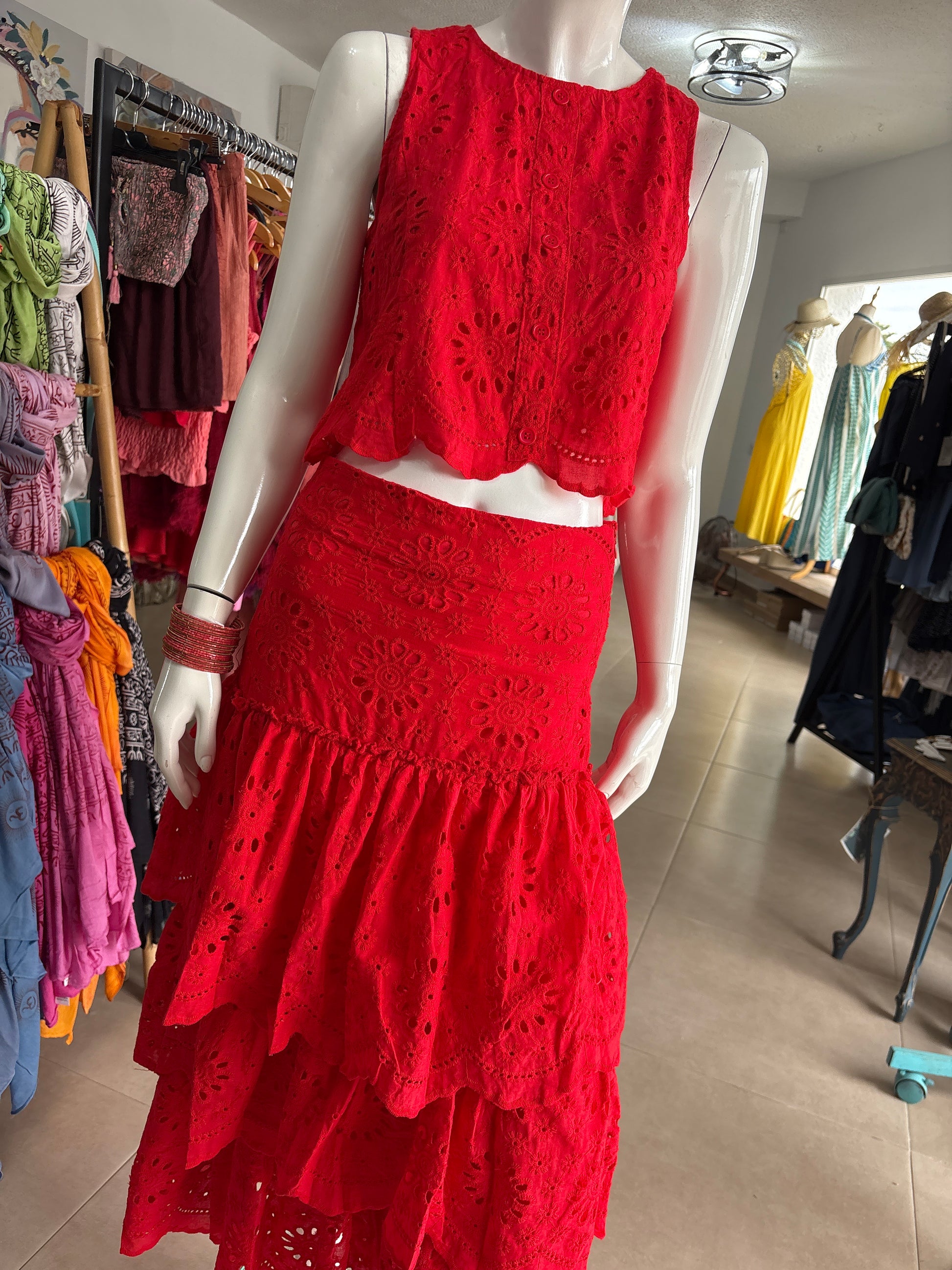Beautiful skirt and top two piece. Skirt is fully lined with tiered ruffles and a side zip top sits at waist with a scalloped hem and comes fully lined.