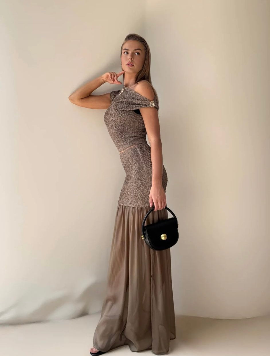 Ruched material with a sheer skirt figure hugging head turning jaw dropping outfit!