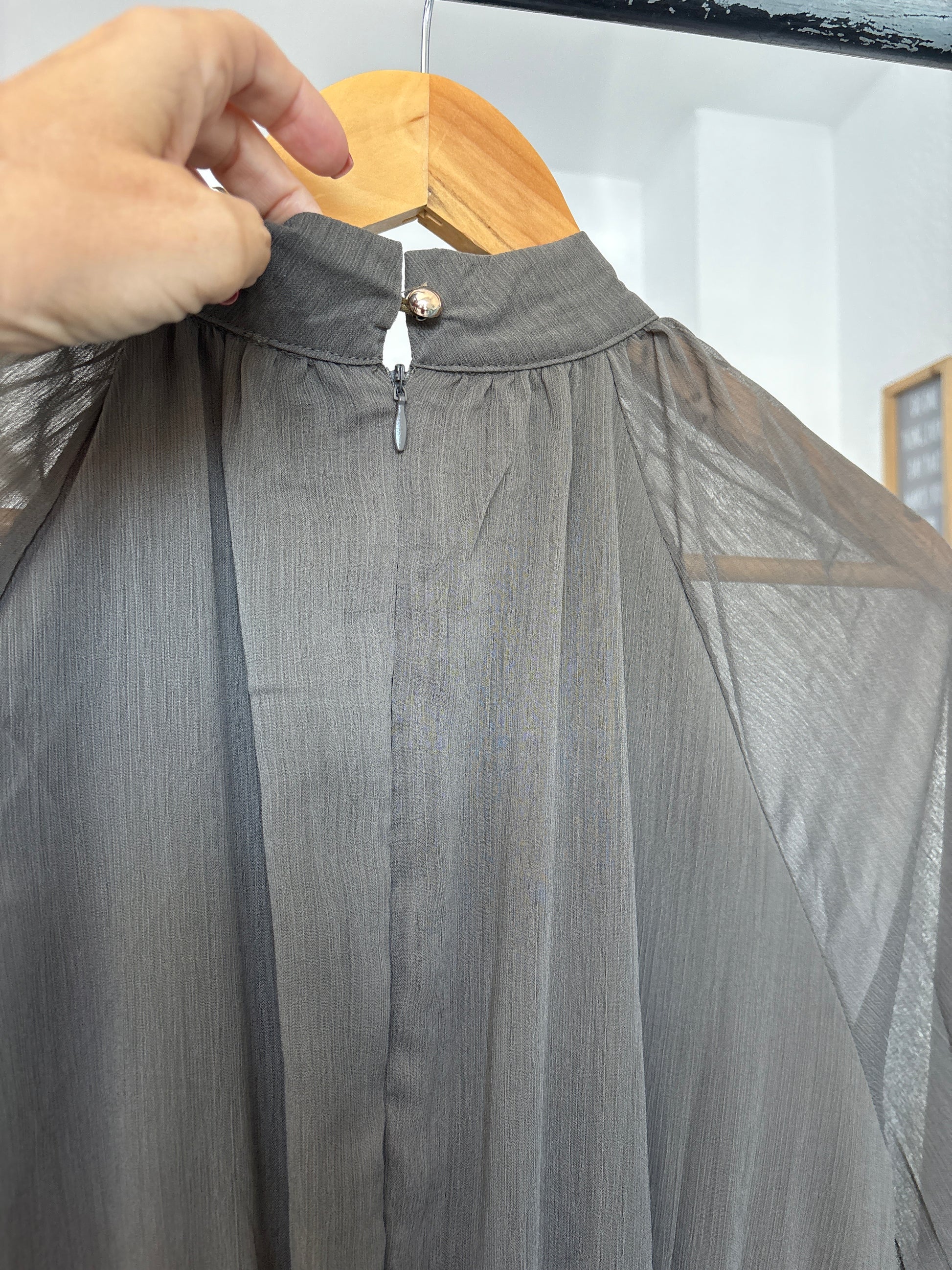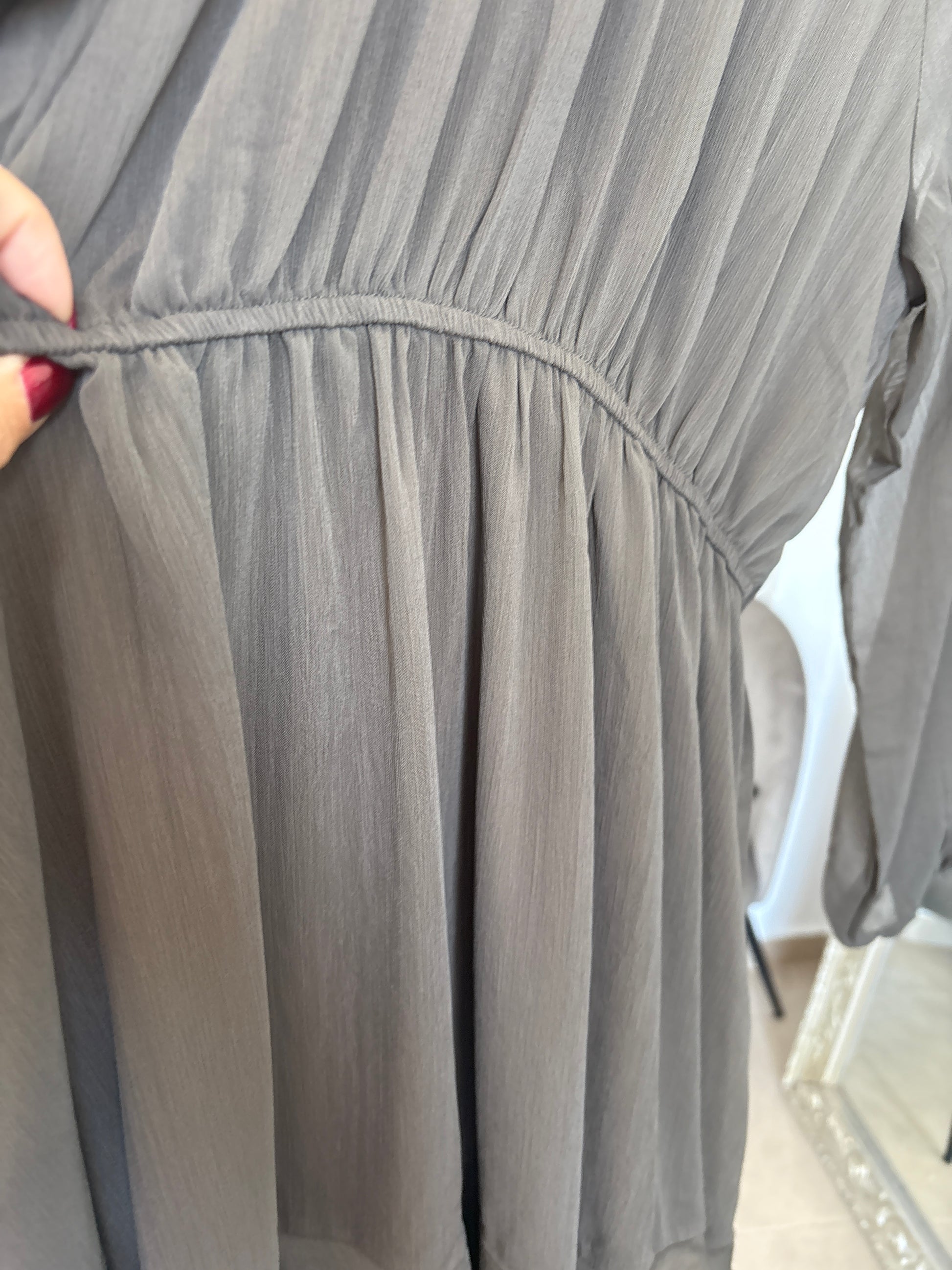 Transparent sleeves, elasticated waist with detachable belt, tiered skirt, zip closure at back with high button to ensure perfect fit