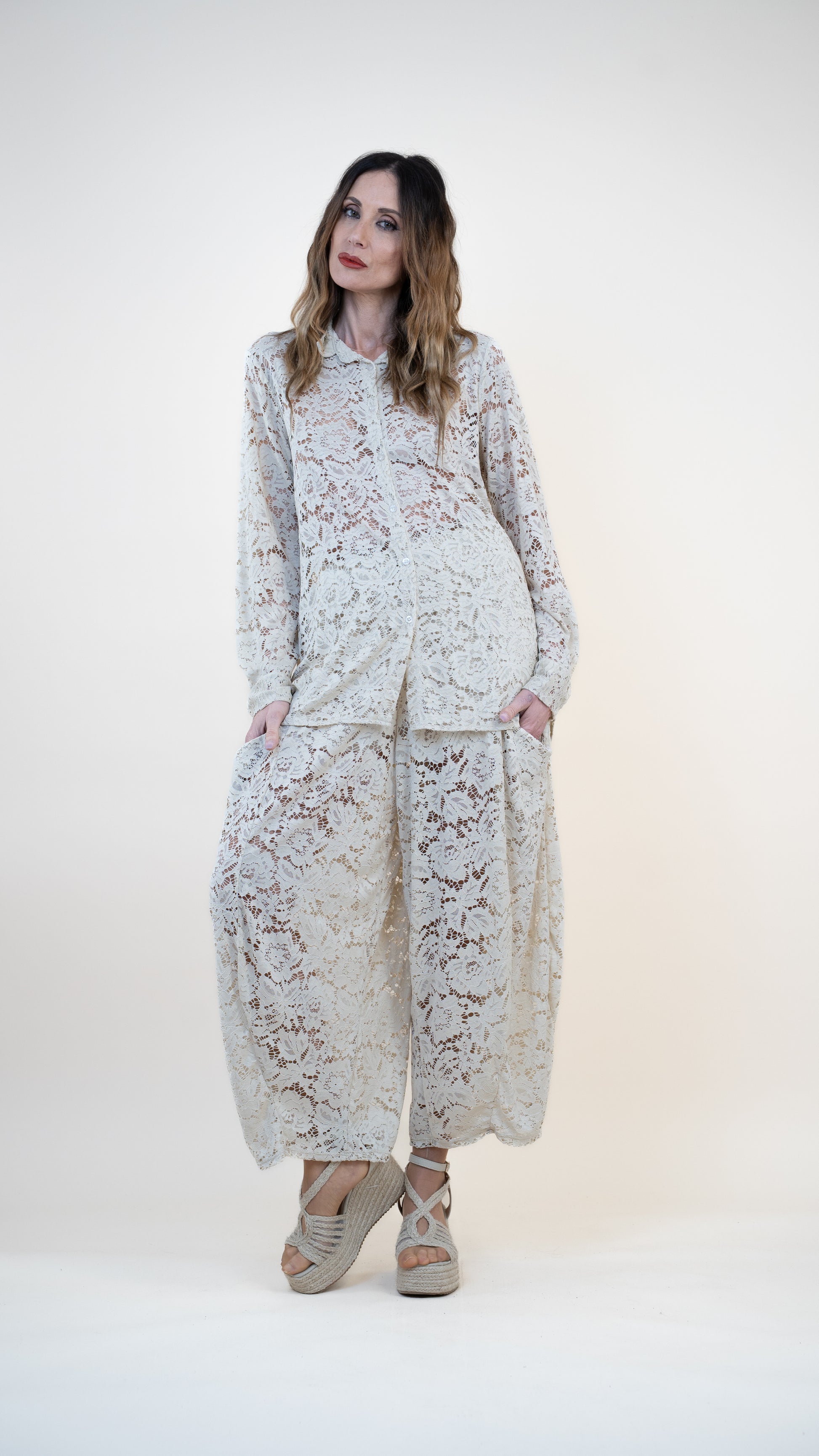 Elevate your repertoire with this beautiful lace shirt. Featuring button fastening, this piece promises versatile styling options. Balance the delicate nature of the fabric with tailored trousers or for maximum impact pair with matching trousers