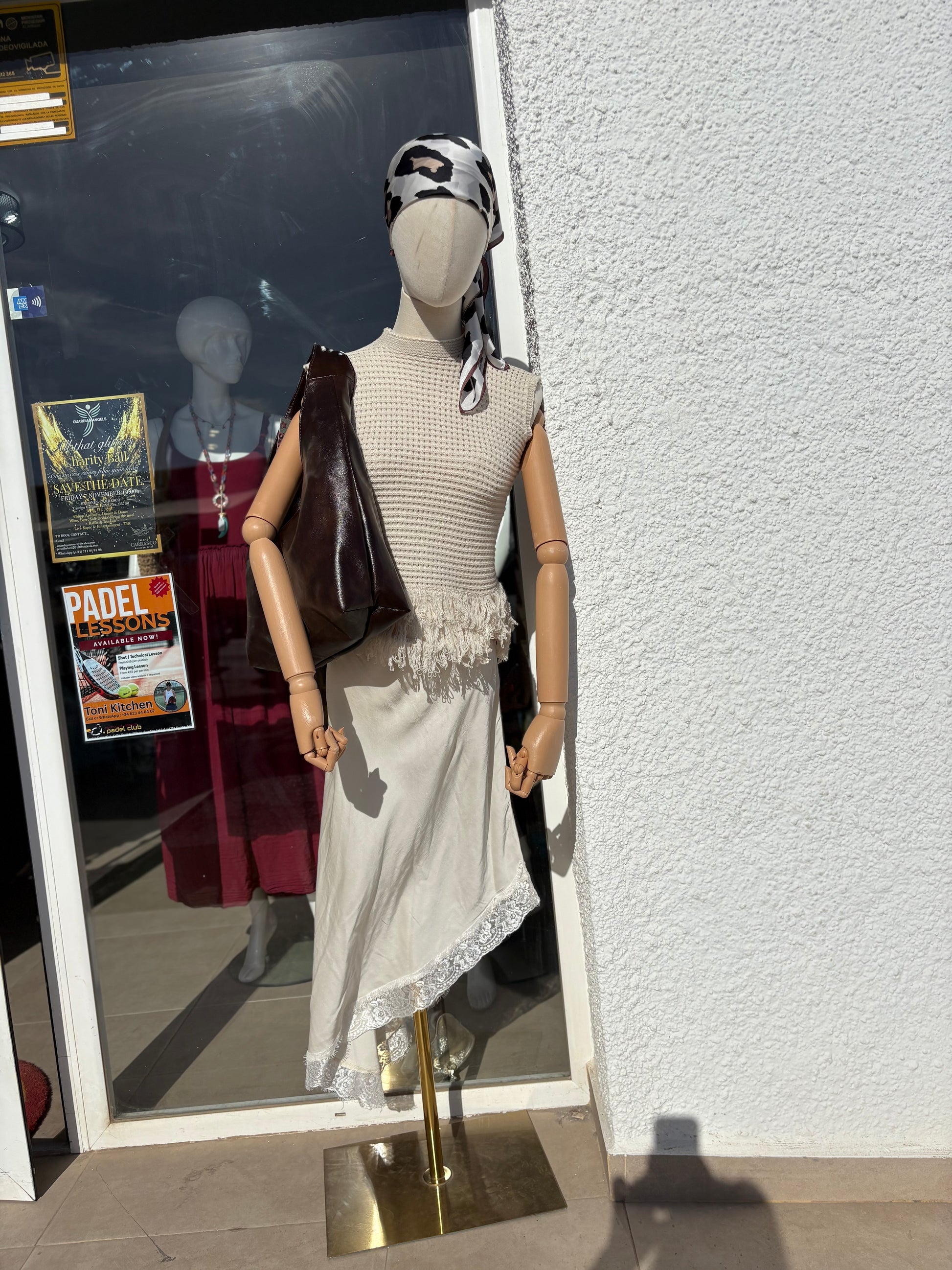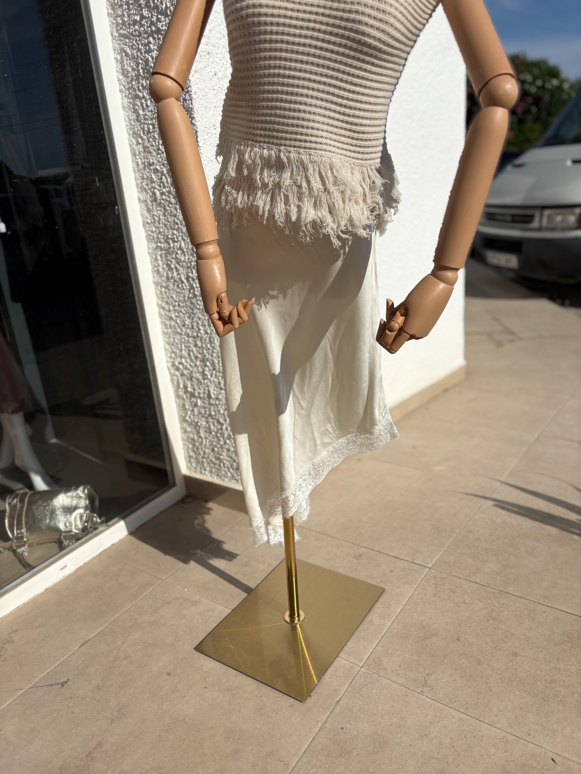 elasticated waist for comfort with a lace trimmed Assymetrical hem to ensure a touch of wow